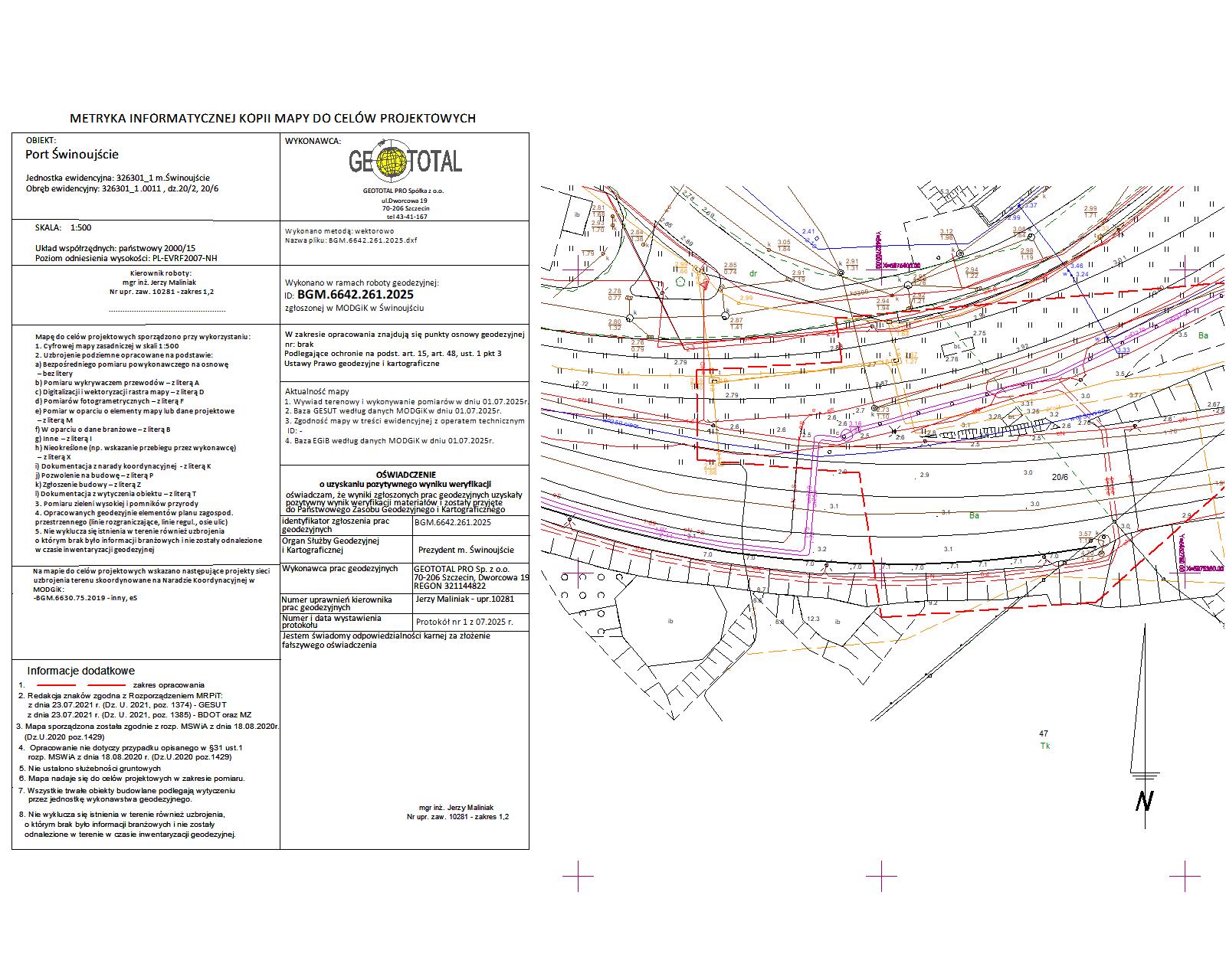 Mapa zawiera dane o granicach, aktualne informacje o sytuacji terenowej i uzbrojeniu podziemnym a także informacje o uzgodnionych projektach.